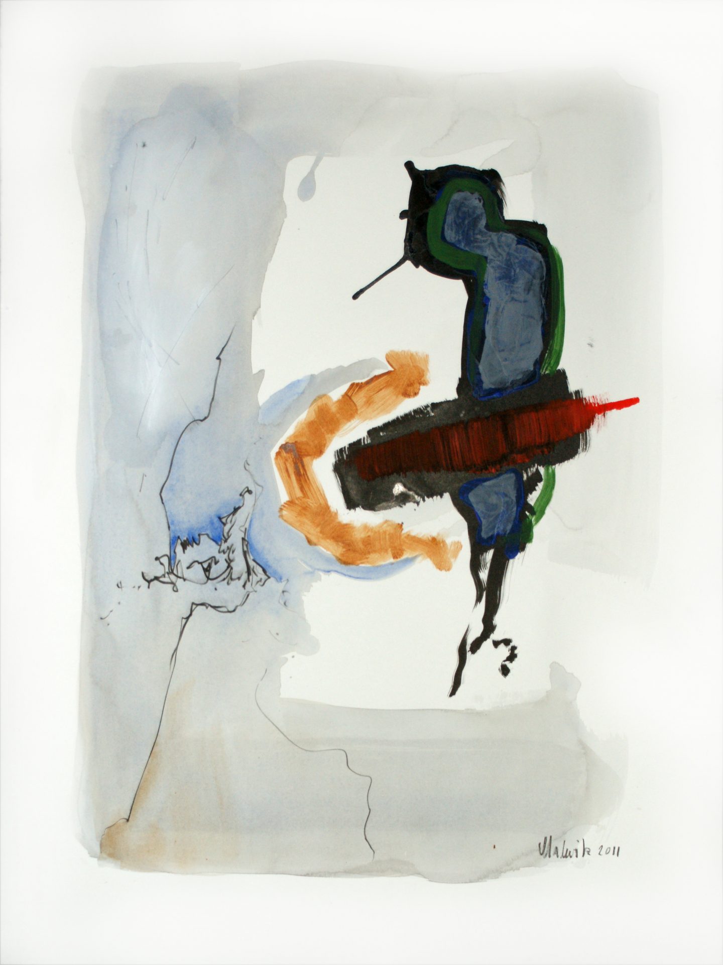 „Ohne Titel“ ist ein energiegeladenes Originalwerk von Eberhard Malwitz, das die Kraft von Bewegung und Emotion auf die Bildfläche bringt. Eine wirbelnde orangefarbene Form steht im Zentrum, umgeben von kühnen schwarzen und blauen Pinselstrichen, die wie Impulse durch die Komposition fließen.